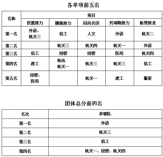 11月3日上午,学院第十届教职工趣味运动会在我院南区篮球场如火如荼的举行。全院共14个教职工小组参加投篮、跳绳接力、同舟共济、托球接力跑和板凳接龙等5项比赛,最终外国语系工会小组夺得桂冠。机关工会第三小组、信息工程系工会小组分获二、三名。