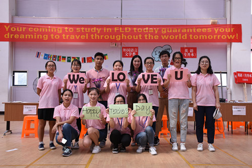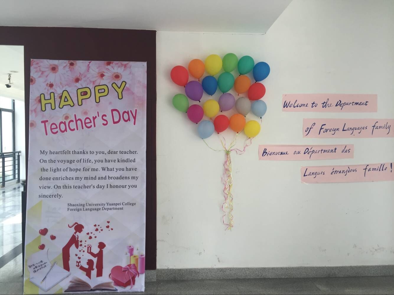因此,为迎接教师节的到来,我系进行了精心的安排。在教学楼的楼道中,我们的同学事先进行了装扮,让老师和学生们能够在新学期看到新的风貌,让所有人都能感受到外国语系这一大家庭的温暖。在教师节当天,老师们还收到了系领导、学生会分别发送的温暖的祝福短信。