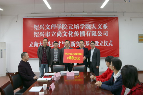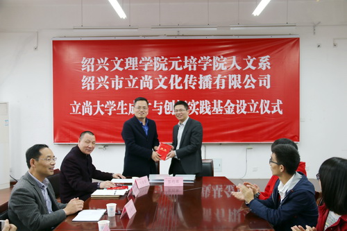 在基金设立仪式上,人文系与绍兴市立尚文化传播有限公司还就校企合作进行了签约,并聘请劳立江董事长为人文系创业导师。据了解,该基金主要用于奖励文明表现、专业实践、科研竞赛、创新创业等方面获得优异成绩的学生。