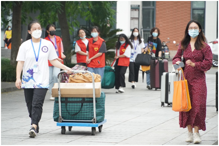 报道手续完成以后,志愿者们将陪同新生前往行李暂存处领取行李引导至学生公寓;此外,为了让新生更加迅速地熟悉学校地形,明确教学楼、学生公寓和图书馆等重要地点,分院团总支学生会通过发放定制明信片等活动来激发新生探索学院风貌的热情。
