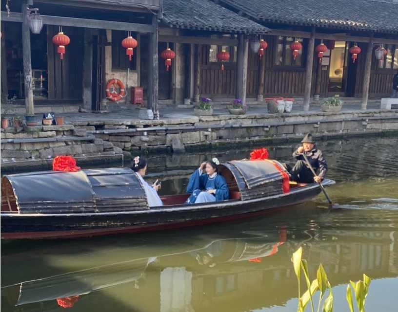 全体学生在老师和工作人员的引导下在小镇内观摩学习,收集文化素材。在这里,有的学生被乐器所吸引,停驻不前;有的学生第一次体验了绍兴的乌篷船,在水上嬉戏打卡;有的学生专心致志地站在台前,听着绍兴莲花落,感受绍兴的戏曲文化;有的学生品尝了绍兴桂花藕粉,不禁竖起拇指;也有学生感叹:疫情让我们错过的三年正在慢慢地弥补我们。