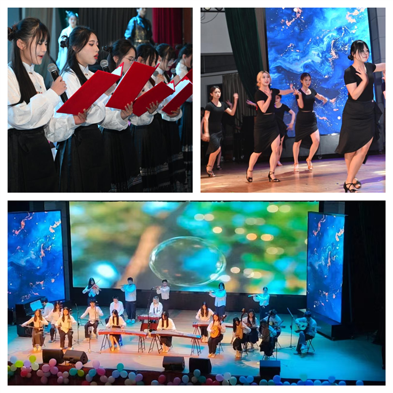 开幕式结束后,暖场节目武术表演《武韵华章》拉开晚会序幕。本次晚会共分为“满‘新’欢喜”、“‘新’火相传”和“‘新’欣向荣”三个篇章,通过歌曲、舞蹈、朗诵、话剧、走秀等形式充分展现中华文化魅力和学子青春活力。在《我和我的祖国》大合唱中,晚会圆满落下帷幕。