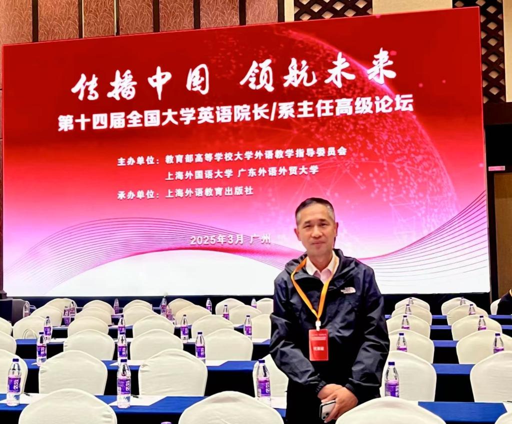 3月14-16日,第十四届全国大学英语院长/系主任高级论坛在广州顺利召开。本届论坛以“传播中国 领航未来”为主题,探讨如何通过课程建设和数字平台,提升大学英语教学在交流思想和增进理解中的作用,学生自主学习,助力构建具有中国特色的国际外语教学体系。我院教学督导陈金中出席该论坛,聆听专家分享英语教学前沿动态和改革方向,吸取先进经验。
