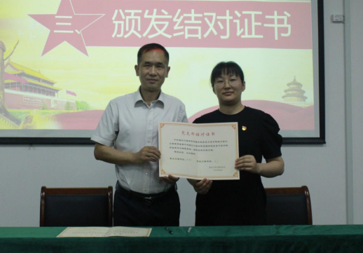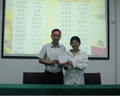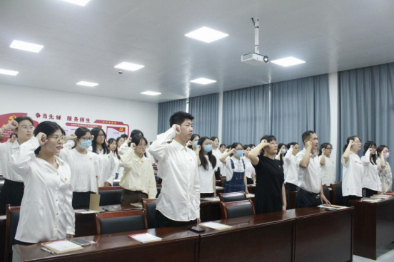 会上,隆重举行了第三十一期预备党员入党仪式,党支部书记为预备党员佩戴党徽,全体预备党员宣读入党誓词,解读 “承诺践诺·岗位争先”细则,签订志愿服务卡,预备党员代表作表态发言。教工第二支党部书记与学生第三党支部书记签订支部共建协议,教师党员与学生党员签订结对卡。