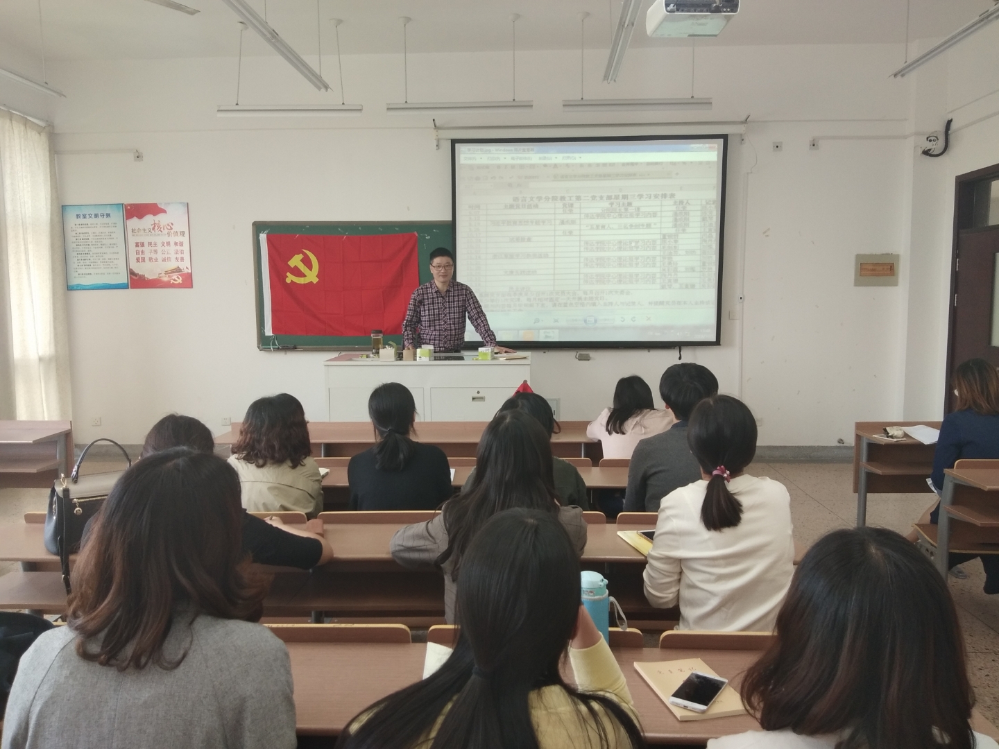 2018年10月17日下午14:00,教工第二党支部在教学楼4-403教室以“党支部组织生活会议内容及记录时应把握问题”召开支部大会,由语言文学分院教工第二党支部书记任荣主讲党课,支部全体党员出席。