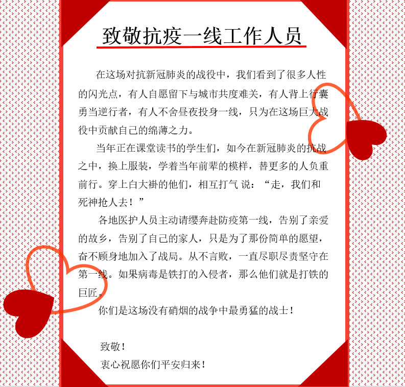 2.同时党员还观看了抗击疫情一线先进人物事迹报告会,在线上进行了讨论表达了自身的观点。战斗在一线抗疫一线的医护工作者真的让人心生钦佩。突如其来的疫情,病毒可怕,但是我们在疫情之下,也看到了无数温暖人心的瞬间。那些奔赴战场的勇士——医护工作者们,他们也会担忧害怕,也有家人的牵挂,但是他们仍旧选择一路逆行,这是他们的责任担当,是他们的家国情怀,也是他们的英雄本色。致敬援鄂医疗队!致敬逆行者!