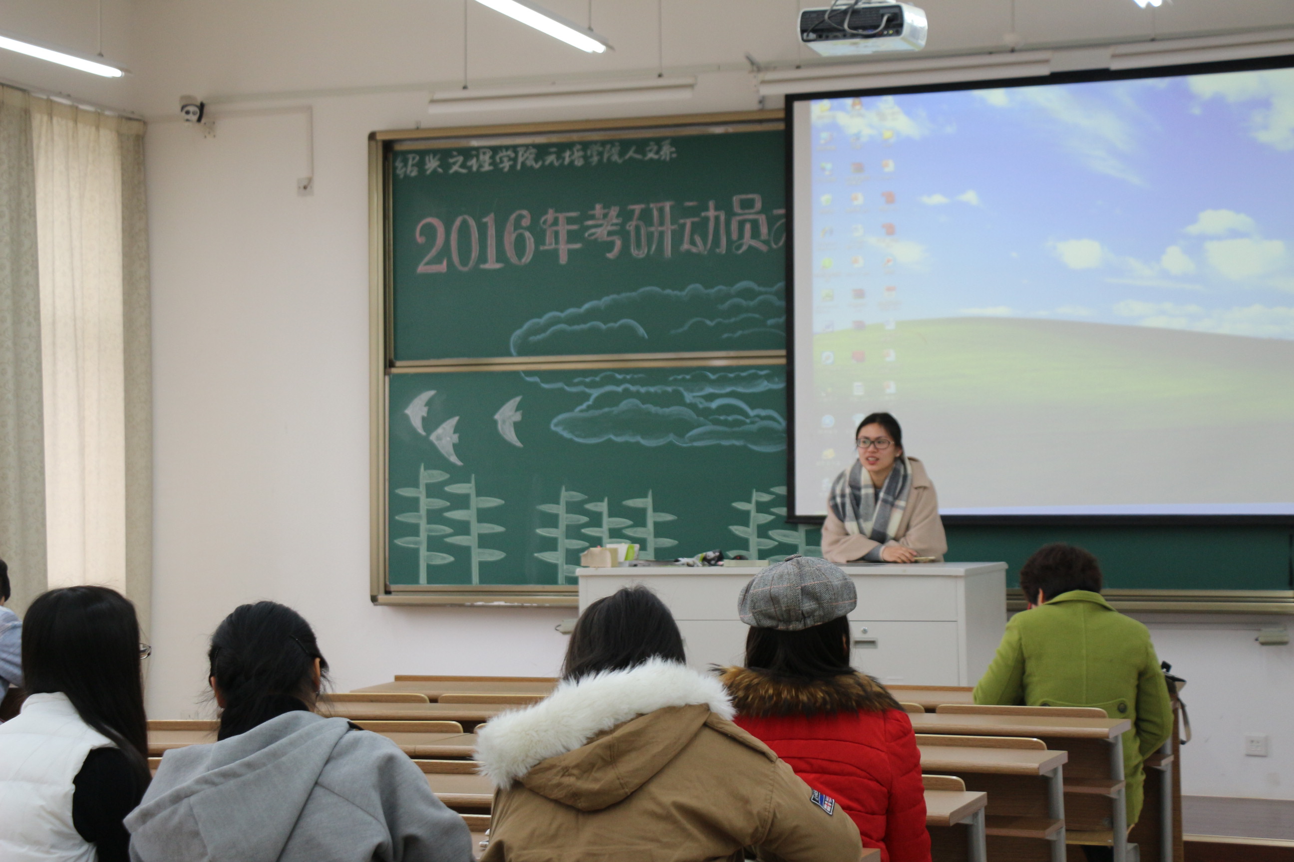 大会第三项,许婷婷老师作了总结性发言。许老师先向同学们展示了学校对考研学子的支持和鼓励,相关政策包括提供考研寝室和考研自习室,以及图书馆保险箱,同样考研资源共享,专人配备老师进行指导,甚至在考研当天会给予一定的补贴,学校也会为考研学子奖金奖励等等,她带同学们对考研的过程进行一个全方面的了解,介绍了一些需要掌握的考研信息。最后,许老师和同学们一起分享了自己的考研心得。她讲述了自己当年考研时经历的一些波折、困惑,在温馨愉悦的交谈氛围中,也让同学们有了进一步的思考:为了考研,我们从现在开始应该为自己的未来做怎样的打算。