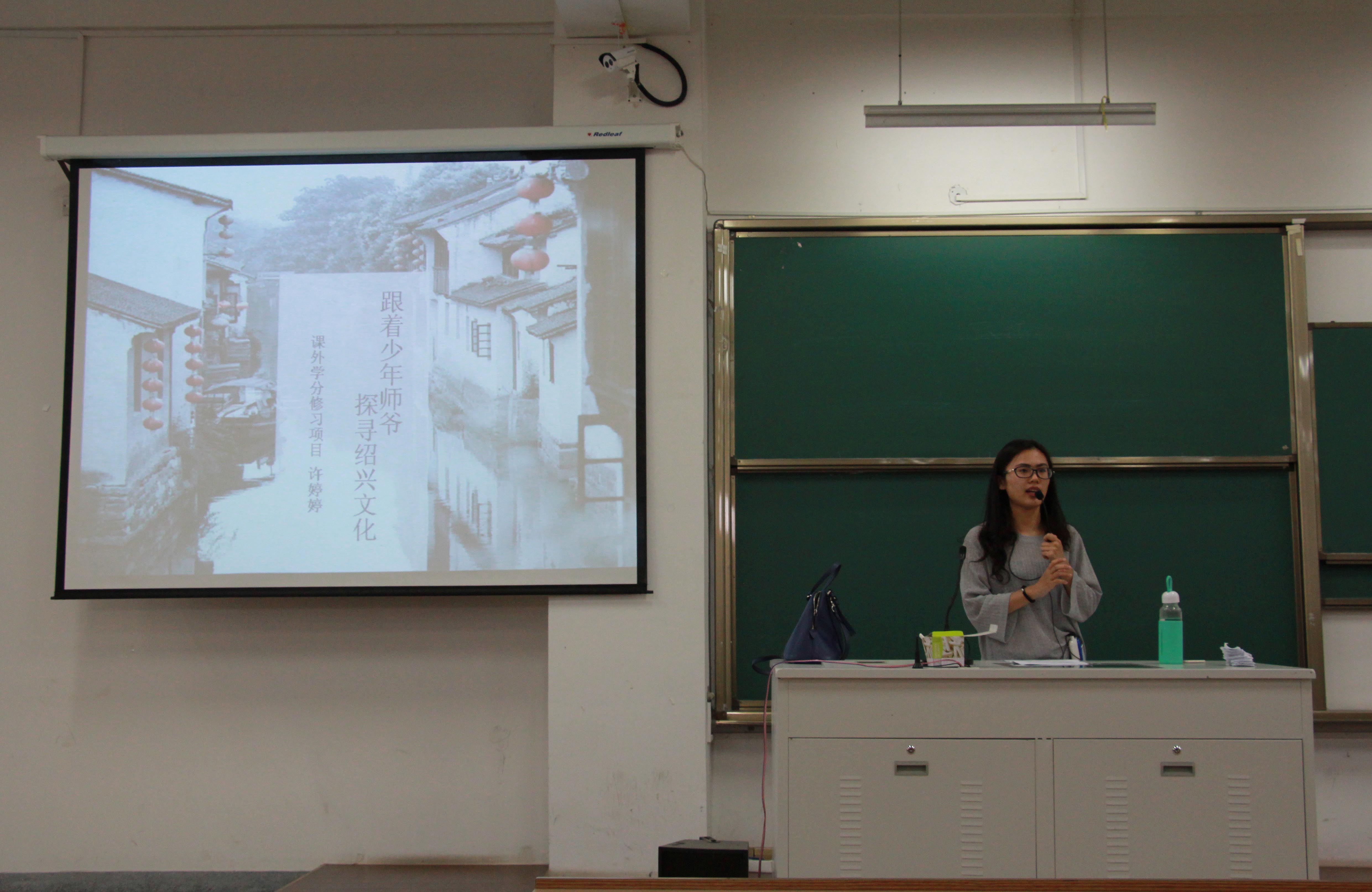 10月21日下午1:10,由人文科学系辅导员许婷婷老师主讲的课外学分修习项目——“跟着《少年师爷》探寻绍兴文化”第一课在经管楼南109正式开讲。 该课采用了多元化的教学形式和手段,以已获得一定影响力的动画片《少年师爷》为契机,通过带领学生走访动画片中的场景,体会和了解绍兴特色元素,引导学生以一个全新的方式重新认识和解读“绍兴”这座历史文化名城。