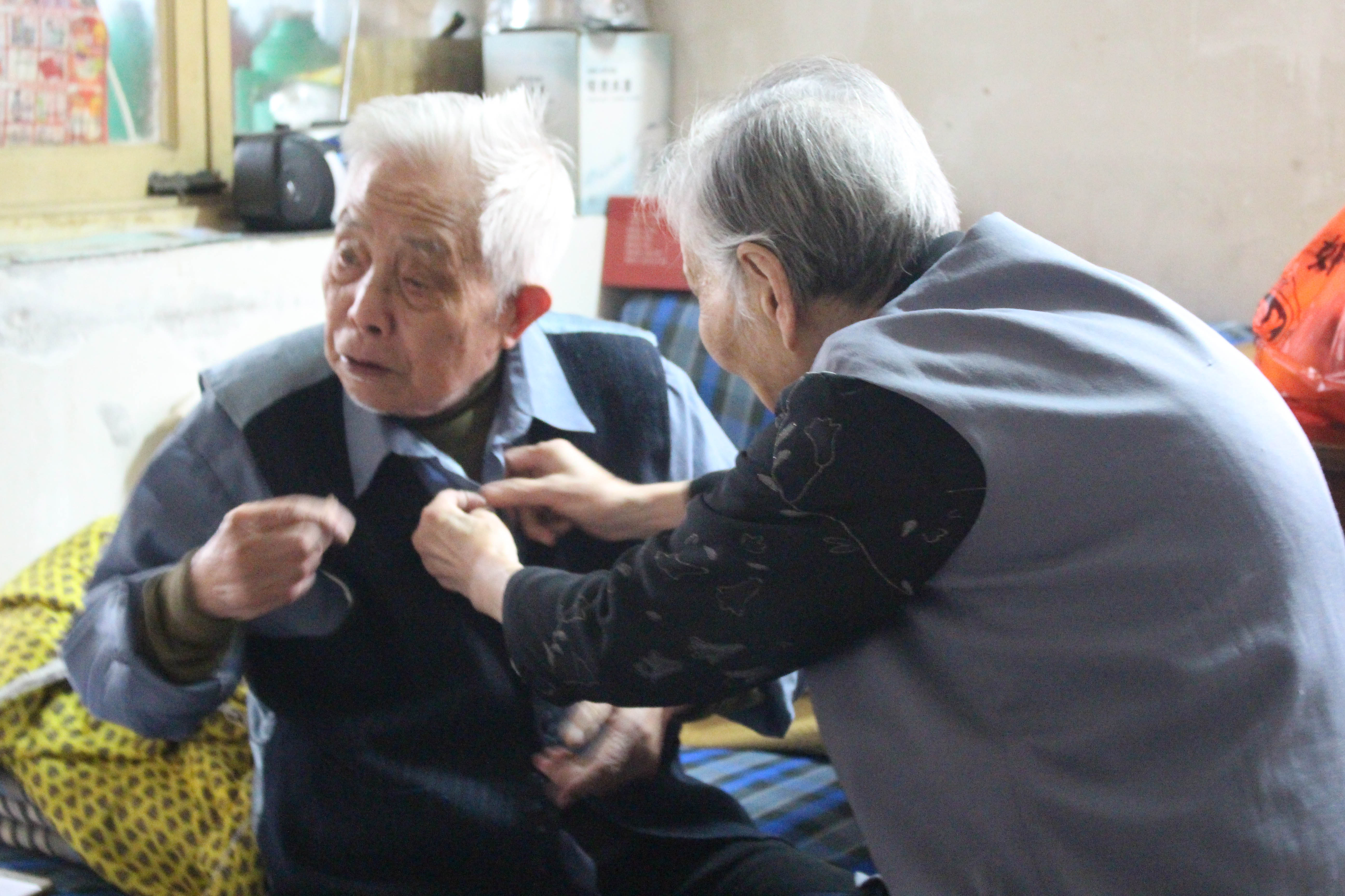 随着窗外雨点作响声愈来愈大,陈爷爷的精神状态变得不太好,实践小队的成员对其家人的配合表示感谢,并打算合照留念后离开。此时的奶奶细心地把爷爷的衣服领子一个个地扣上,擦了擦他的嘴角,并且不断地调整了爷爷后背靠着的被子,垫上枕头,使人显得更加精神些。当要求奶奶一一同合照时,奶奶起初害羞地表示拒绝,但是陈爷爷却拉着奶奶的袖子不放。大儿子笑笑表示:“两位老人在一起七十多年了,从来没有分开过,真的是离不开的。”