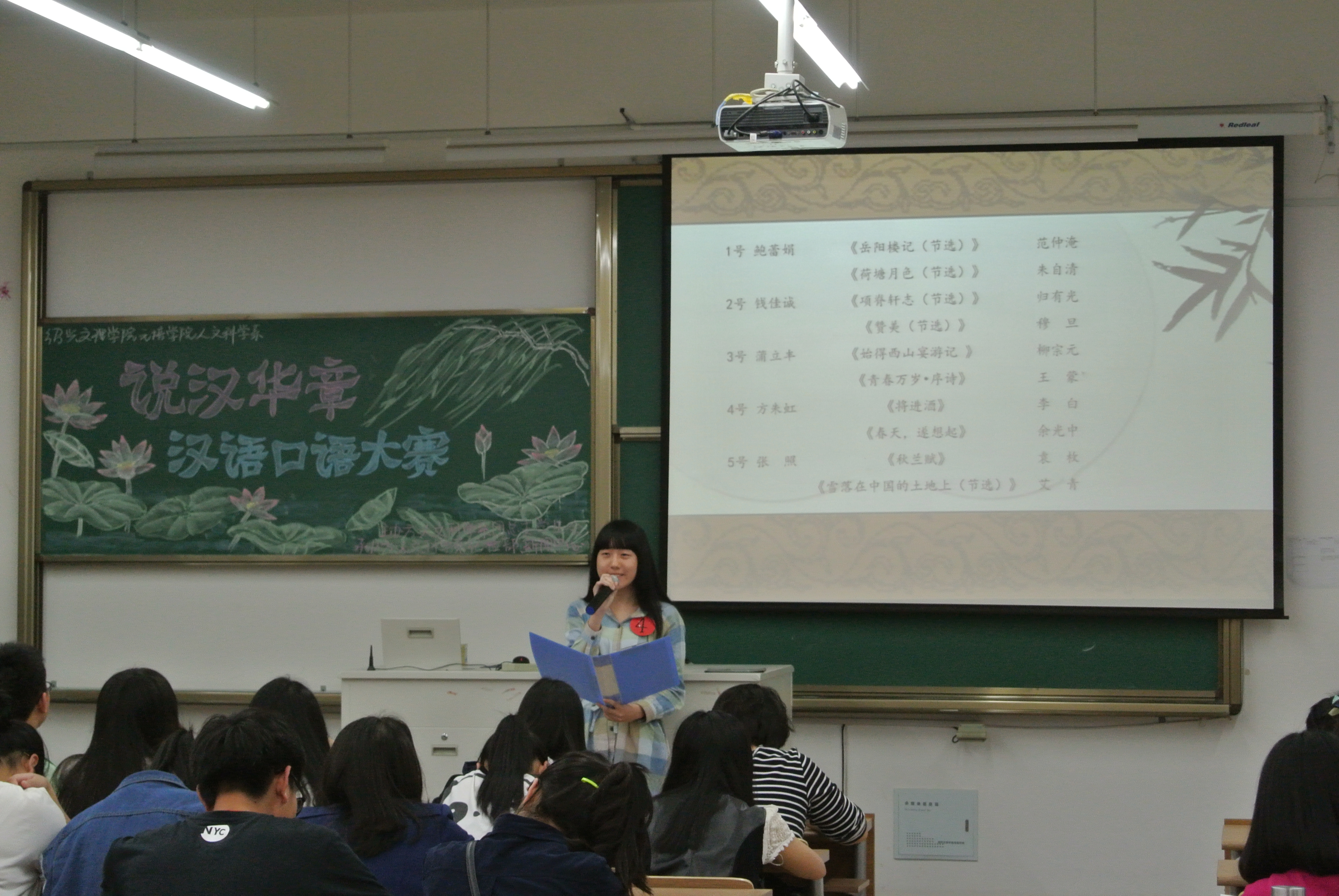 5月27日晚,我系“说汉华章”汉语口语大赛决赛于人文楼303教室举行。我系马芹芬、孟念珩、陈利老师作为评委莅临现场,对晋级决赛的10位选手进行选拔。本次比赛为我院在内部的省赛选手选拔赛,比赛还未开始,场上气氛就凝重了起来,一场学识与口才的比拼悄然拉开大幕。