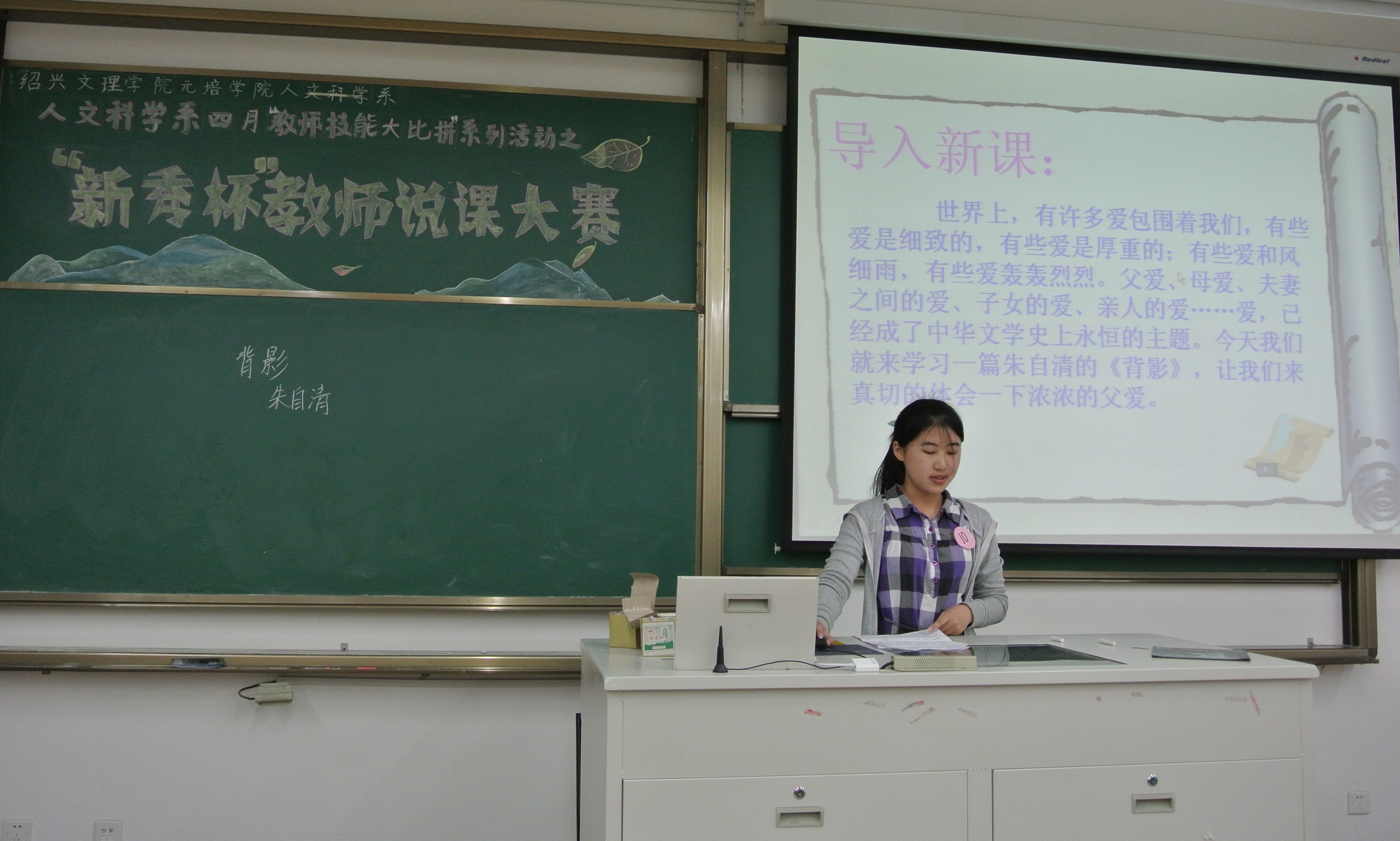 本次比赛规则简明,要求参赛选手自选题材,按照事先抽签的顺序上台,在10分钟时间内完成说课,而后由评委酌情打分进行评比。首先上场的1号选手蒲立丰带来的是朱自清的《背影》,她那沉稳细致的说讲,一举一动间尽显教师端庄。而后的2号选手周金璐则以大众熟知的《卖火柴的小女孩》进行讲说,她将说课内容与PPT自然结合,把自己的主讲内容详细地按照“说教材”、“说学情”、“教学目标”、“教学重难点”、“教学方法”五块内容进行布置,从朗诵全文认字词开始,到了解文章背后的深层意境,循循善诱,简单易懂。周金璐选手以颇具潜力的教师素养展示了本次大赛的风貌。