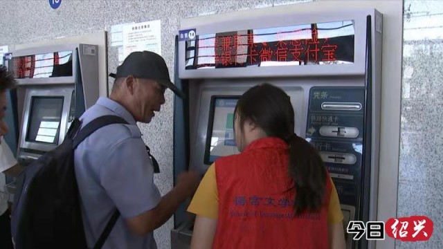 上午九点,在高铁绍兴北站售票厅,志愿者李金飞正和同学一起引导乘客有序排队购票取票,己所能及地帮乘客解决遇到的问题。