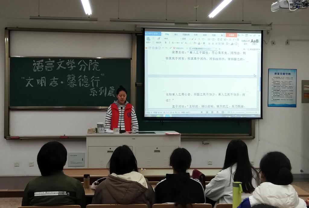 “立身以立学为先,立学以读书为本。”读书不仅增见识长学问,拓展思路,更能消除寂寞,净化心灵。11月19日至23日,由语言文学分院自管会举办的为期一周的读书周系列活动在语言文学分院2018级各班举行。早自习晨读作为活动之一,正在分院大一各班积极开展。中国语言文学类、外国语言文学类各班纷纷参与进此次活动,由分院招募的志愿者进行领读,在各班内开展晨读。