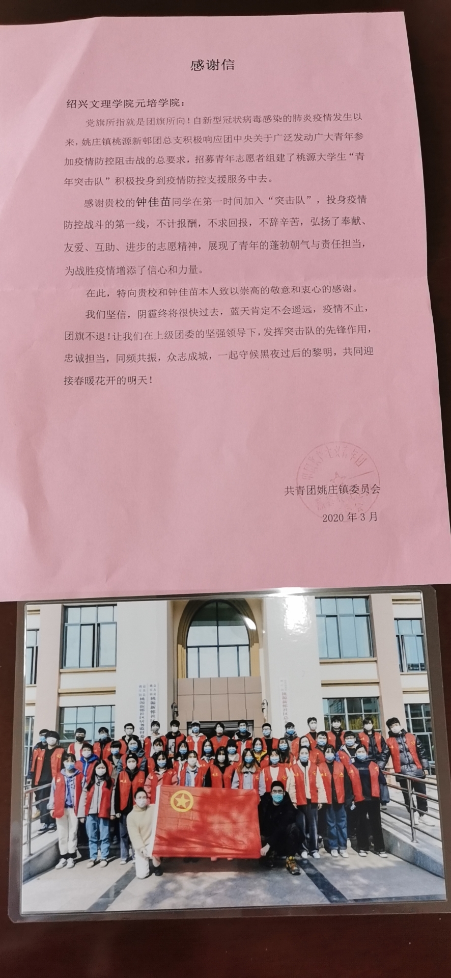 近日,我院收到来自嘉兴市嘉善县姚庄镇团委的一封感谢信,信中赞扬了我院语言文学分院汉语言1801班钟佳苗同学积极投身基层防控工作,高度弘扬了青年大学生的社会责任感。信中写道“贵校钟佳苗同学在第一时间加入青年突击队,投身防控战斗的第一线,不计报酬,不求回报,不辞辛苦,弘扬了奉献、友爱、互助、进步的志愿精神!”同时也向学院表达了衷心的感谢!