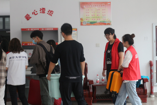 随着新生的逐渐增多,身穿蓝白色制服的迎新工作人员从止步校门的新生父母手中接过新生的行李和随身物品,带领他们前往分院报道点,他们用温暖的微笑、热情的话语、耐心周到的服务,让初来乍到的同学们感受到安心和温暖,身穿红色马甲的分院志愿者为新生搬运行李,答疑解惑,满是对新生的浓浓关怀。蓝白色与红色的交织,构成了语言文学分院迎新现场最动人的色彩。